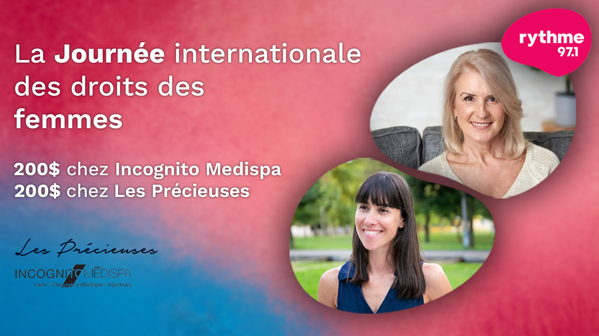 Grâce à Rythme 97.1, Courez la chance de gagner 200$ chez Incognito Medispa ET 200$ chez LES PRÉCIEUSES !