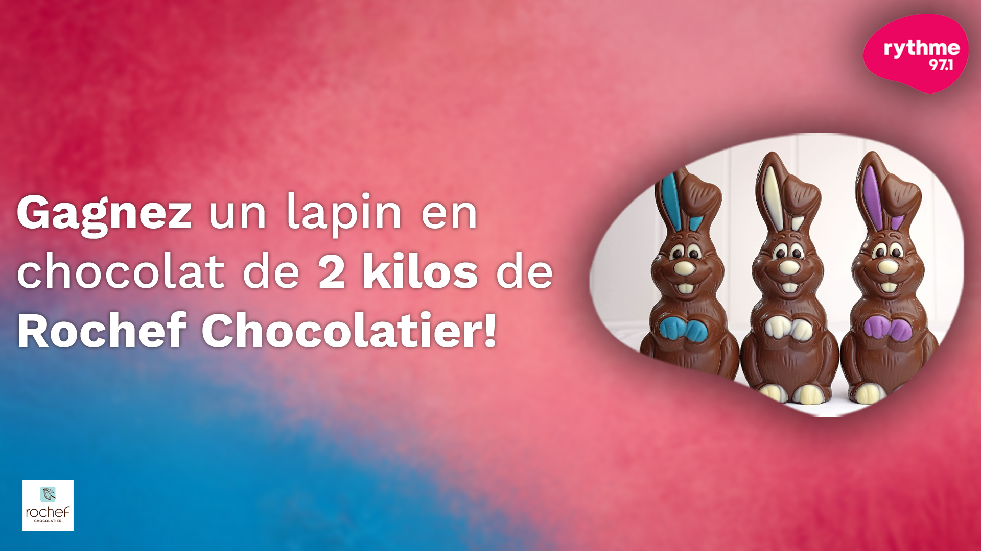 Pour gagner, essayez de trouver où se trouve le lapin de Pâques de 2 kilos Rochef Chocolatier, tous les jours sur notre page Facebook de Rythme 97.1, dès 6h dans Le Matin Juste Pour Le Fun!